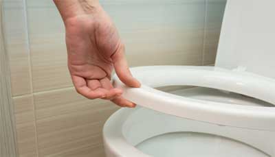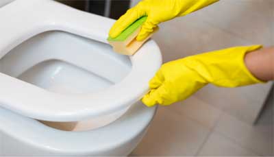 You need to sanitize your toilet seat using disinfectant water. Make sure all the areas, including the hinges are covered as well. Use a scrub brush for hard-to-reach areas and a sponge on other parts. Now rinse and wipe off any water with a dry rag.